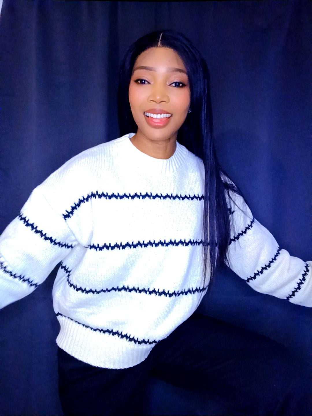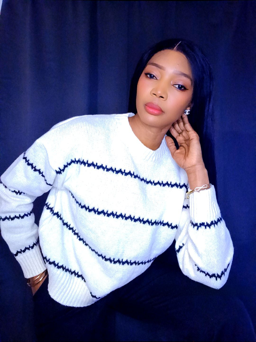 Pull beige rayures noires, col rond, confortable pour l'hiver et l'automne. couleur modifiée à cause de la luminosité.