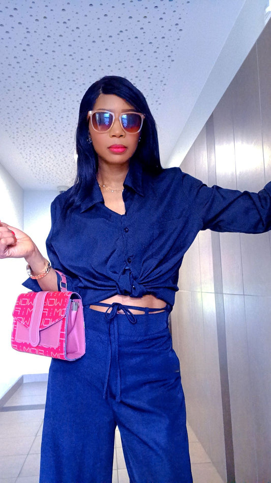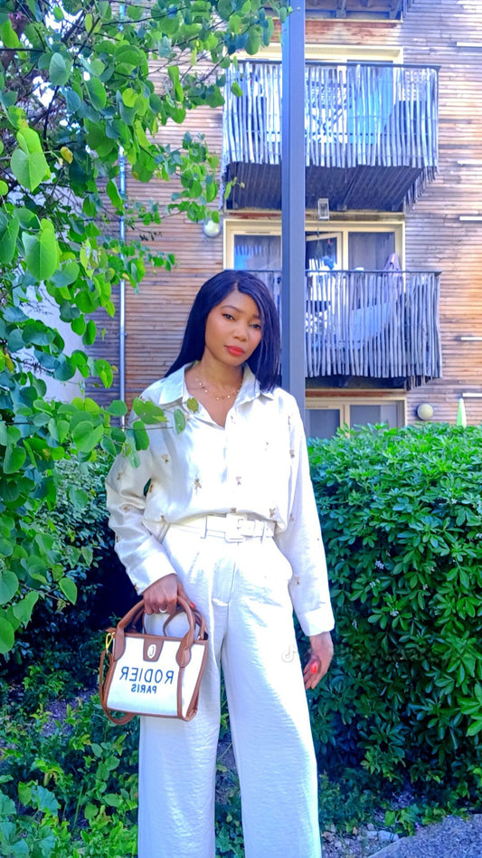 Ensemble pantalon bas large et chemisier imprimé beige+ ceinture beige